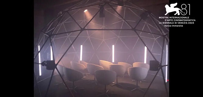 The VR was designed as a communal experience for groups of 12 people seated inside a six-meter geodesic dome wearing synced VR headsets. The group was then surrounded by a sophisticated spatial sound system with sixteen speakers that immersed them in a shared soundscape. The idea is to dissolve the typical solitary VR experience by creating a group experience.