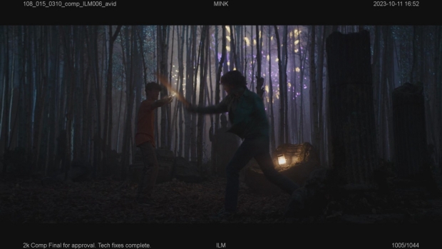 One scene that was really remarkably well done is when Luke [Castellan, a son of Hermes] and Percy square off. It's kind of broken into two parts – first they're training and then they fight for real. That's on a volume where we had a lot of trees that were live action on the volume stage and then, in the content, you had the same kind of trees. And there was a fireworks show going off above their heads that lit the whole place. It wasn’t really a big thing, but the two scenes that are in that particular volume are so successful.