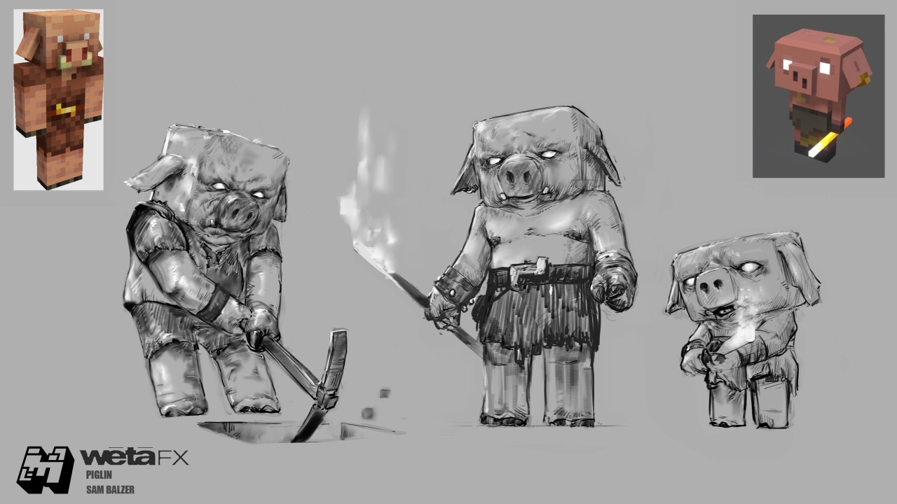 Even though she’s a blocky character, her anatomy is very much a biped, with rounder limbs than the other Piglins. She's got hooves, is somewhat squarish, and her much more bulky mass in the middle was easier to manipulate and move around. Because she would have to battle with Steve in the end, she had to have a level of agility that even some of the Piglins didn't have.