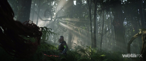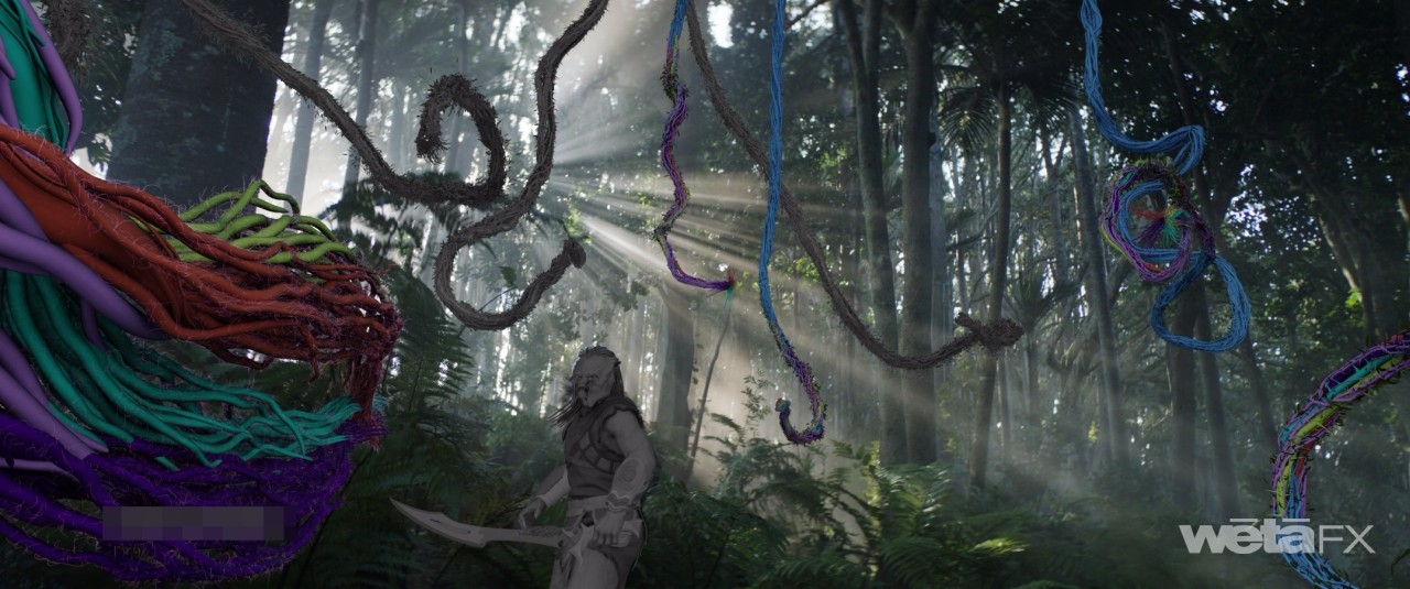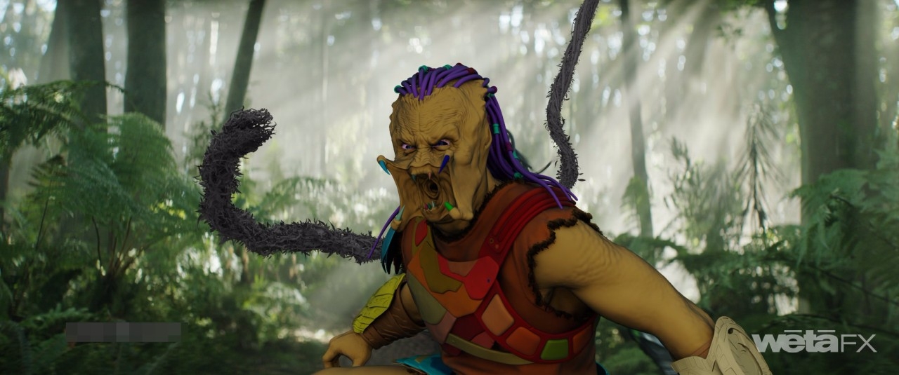 The Kalisk, a giant monster with the ability to regenerate, proved a worthy adversary. “It was a very long journey for the Kalisk to be locked down and become the character that you see on screen now,” reveals Stopsack. “While there were initial concept designs that were done and delivered to us, our art department was also involved. There were characteristics and features reflected in the functionality of the body that were explored. For instance, the initial designs didn't have a lot of these tendrils that you see on the Kalisk. It was a much slicker, leaner appearance at first. Not only do you go through these creative iterations as you’re concepting and designing it, but there's also the form following function aspect. You have to make sense out of the context where you see the creature and how you engage with it; that informs retrospectively how the appearance needs to follow and what features and characteristics you see on the creature.” Eventually, the Kalisk design had to be modified once again to suit the captured footage and editorial requirements. “When the Kalisk first appears in the movie, coming out of this bushy forest and very foggy environment, you want that to leave an impression,” observes Stopsack. “It needed to feel right, and unique. It wanted to be intimidating. Many aspects were still in flux at that point.”