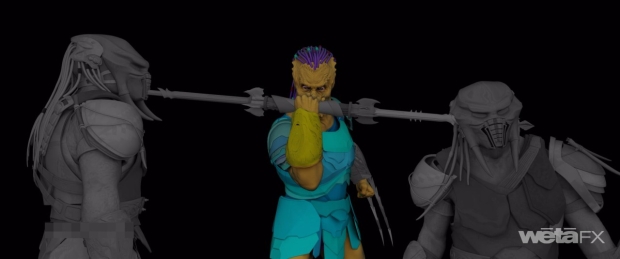 The planet of Yautjia Prime is the setting for a number of family member battles. “Initially, there was one quick samurai movement by Dek and Father was down,” reveals Rapley. “But after test screenings, Dan was looking at it and was like, ‘This needs to be more epic. Fathers should be the ultimate badasses. Dek needs work to take him down.’ Extra stuntvis was done. They came down to Wellington, got in suits, and motion captured it. We were doing extra previs beats, which was awesome. Just opening it up, letting it breathe and seeing these two people come towards each other with the homestead, Dek’s ship landing, and the sandstorm that followed Dek turning on the ship's thrusters. We were putting ideas like that on the table and Sheldon brought it to life beautifully.”